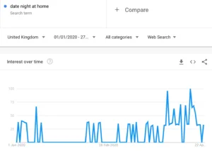 This is a sweet one. While searches for ‘how to propose at home’ and the like remain low (watch this space – we called it!), couples cooped up at home are finding ways to get date night in without needing to leave their four walls.