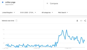 Similarly, not much of a surprise here to see an increase in searches for online yoga. Alongside our lack of access to gym classes are feelings of anxiety, which many are hoping to ease with meditation and yoga at home. The likes of Calm and Headspace are also offering free meditation tracks and sessions.