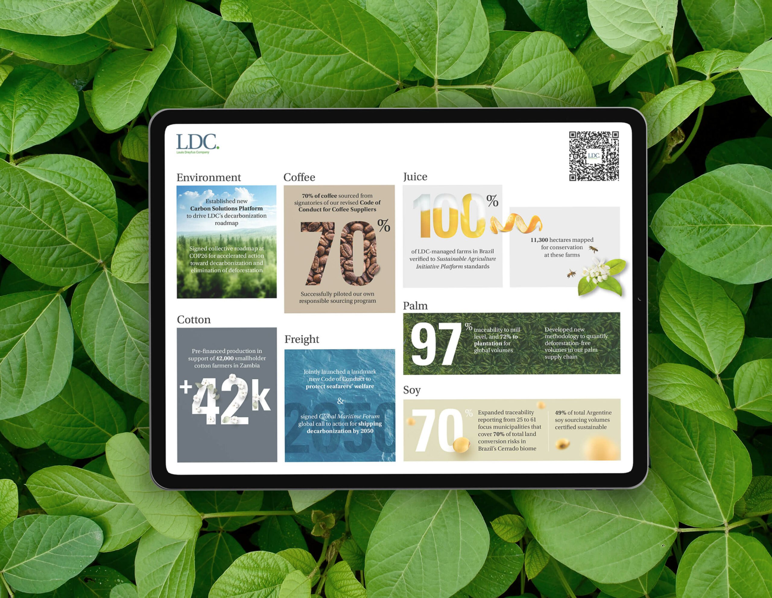 LDC’s 17,000 employees operate in 180 locations in more than 100 countries. Marshalling key financial and sustainability information from such a large and complex organisation requires a high level of planning, coordination and perseverance. Early instatement of a robust project management structures and clear and regular lines of communication between agency and client were critical to the success of both projects.